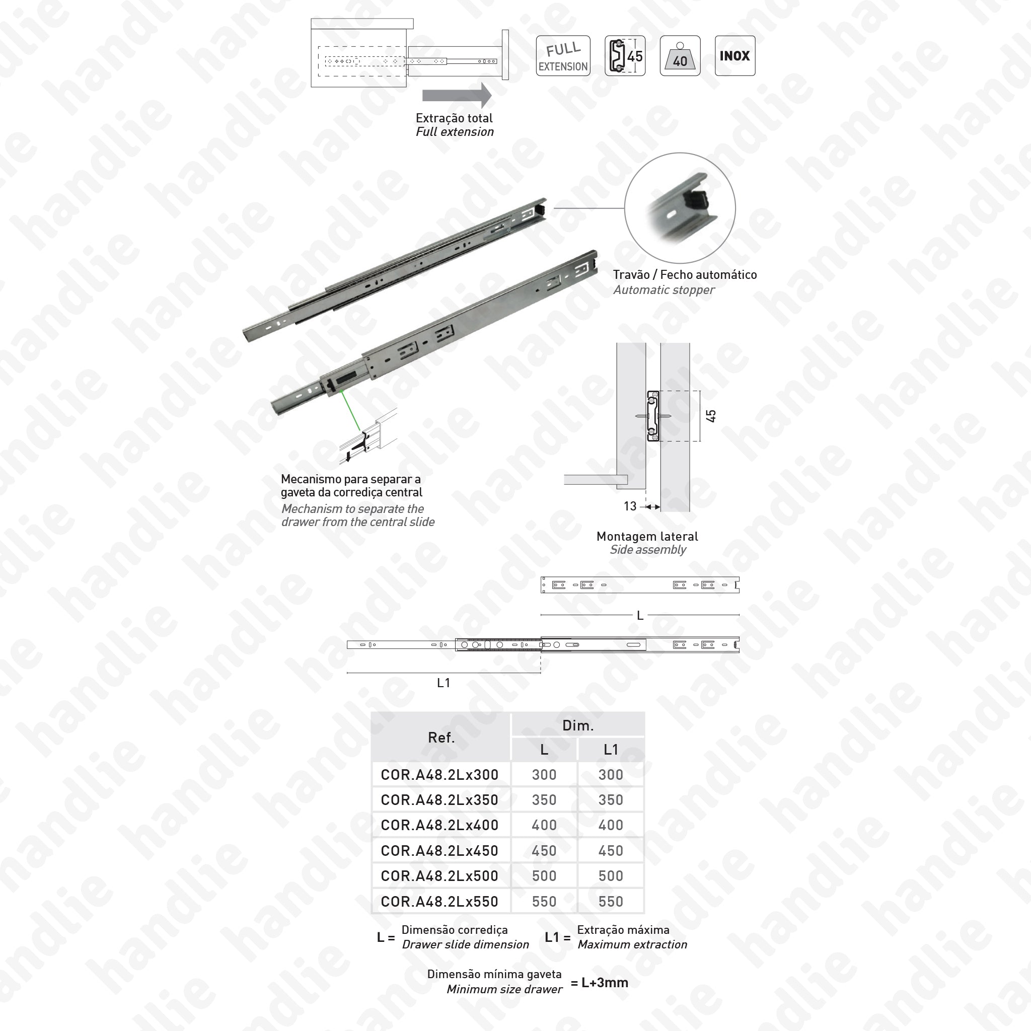 COR.A48.2LCorrediças com esferas A48 para gavetas / Extração total / 40Kg (par)